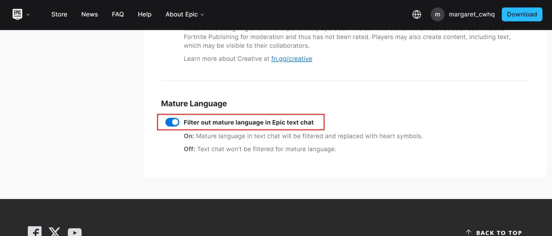 - On: Mature language in text chat will be filtered and replaced with heart symbols.