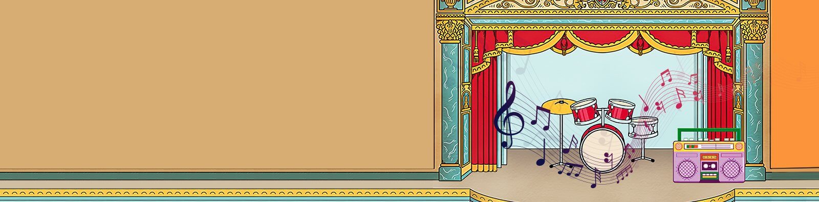 Now, click on the radio to start the background music! Have fun playing alongside the music with your drum set.