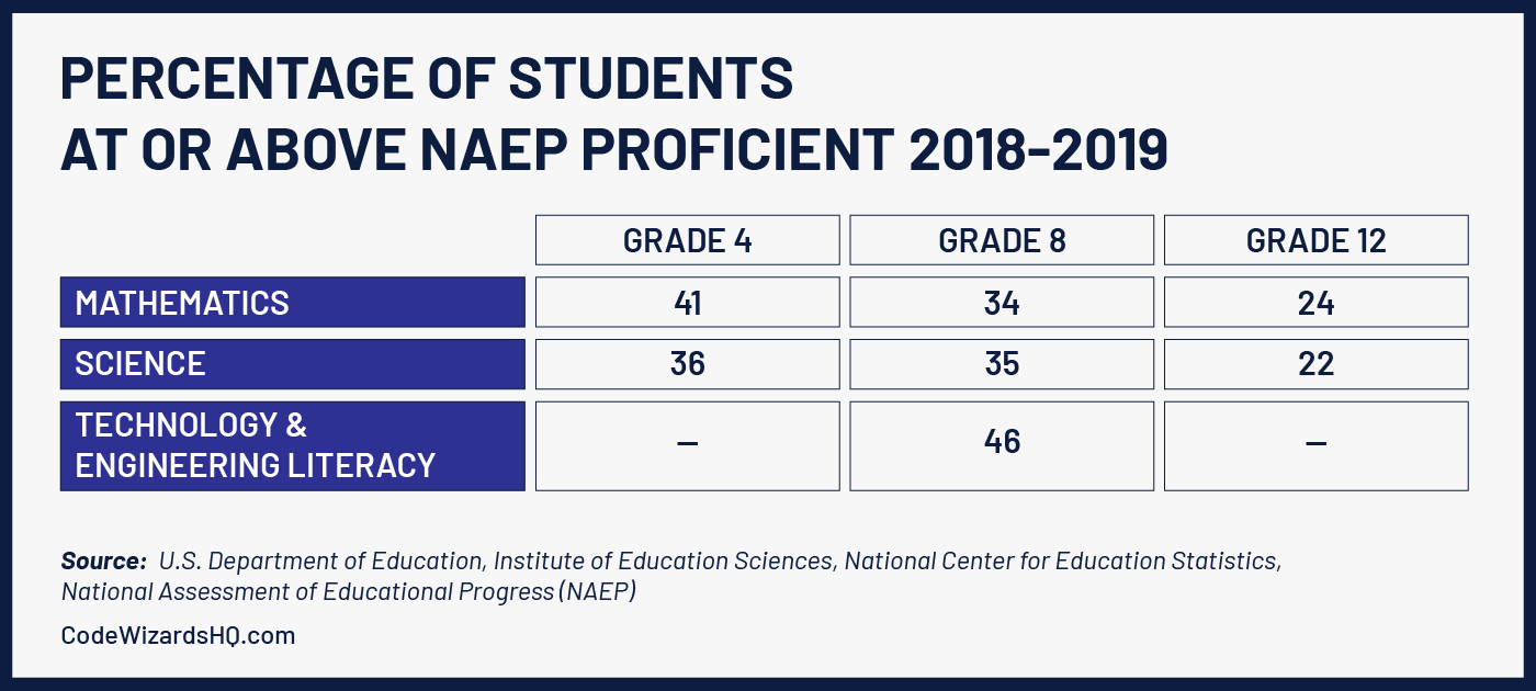 In 2019, the National Assessment of Educational Progress (NAEP), a standardized test administered to US K-12 students, found that only 34% of 8th graders and 41% of 4th graders were at or above average in mathematics. By grade 12, proficiency has decreased to 24% in mathematics and 22% in science.