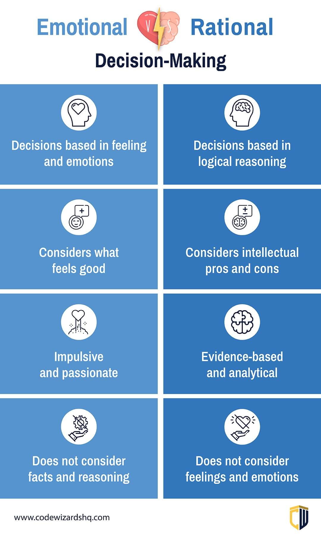In other words, “following your gut”. Emotional decision-making can be impulsive and spur-of-the-moment but also allow for creative flexibility and passion. These are often decisions made with little deliberation when you’re feeling happy, sad, or mad.