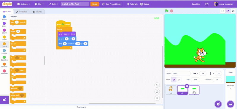 Click the green flag to see your “hills1” sprite moving to the left. Keep it up, only a few steps left!