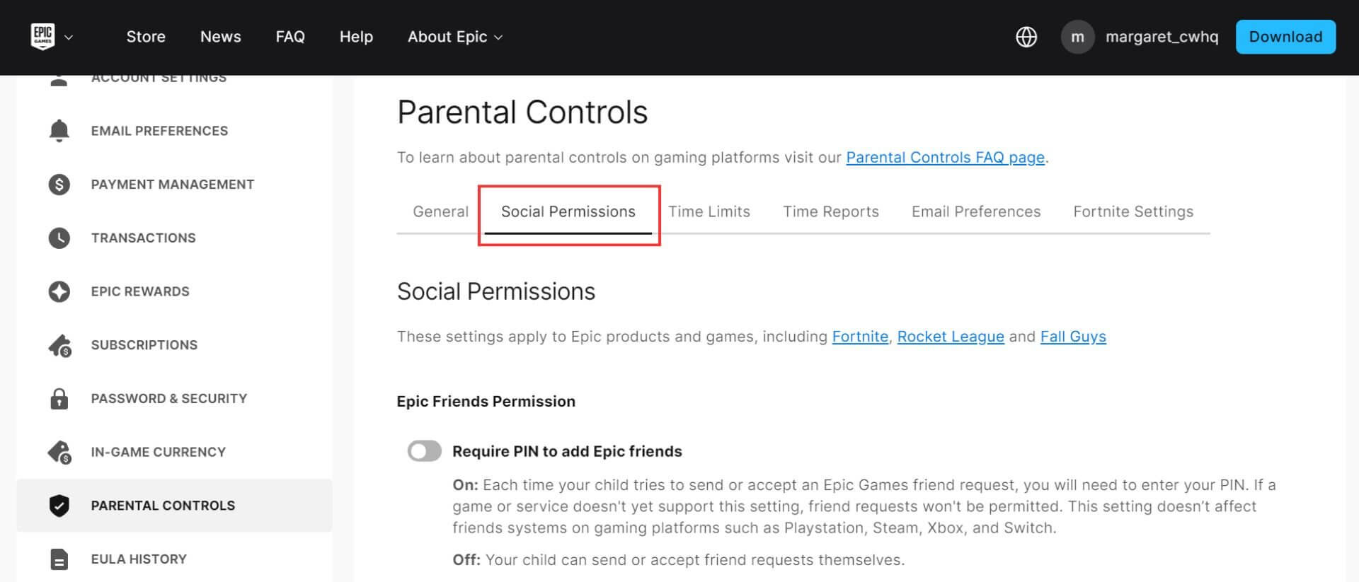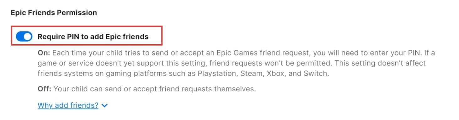 - On: You will need to enter your PIN everytime your child tries to send or accept an Epic Games friend request.
