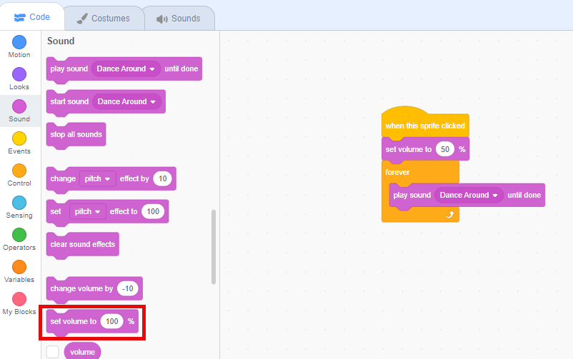 You can also control how loud the background music is by using a “set volume to” block in the Sounds category. Put this above the “forever” block. You can change how loud it is by changing the value in the textbox to less than 100.