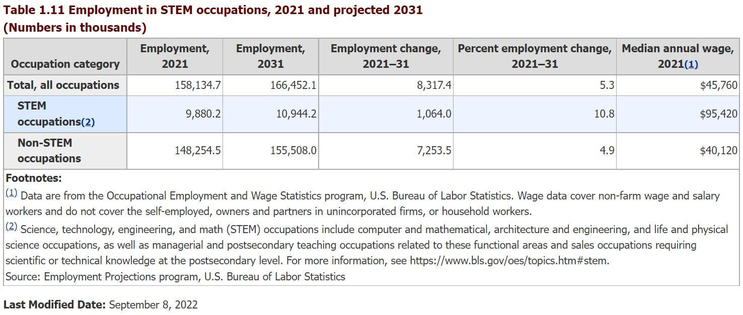STEM sector jobs make up a large part of the overall U.S. market and their importance continues to grow. Between 2021 and 2031, U.S. STEM jobs are estimated to grow by 10.8% compared to 4.9% for non-STEM occupations.