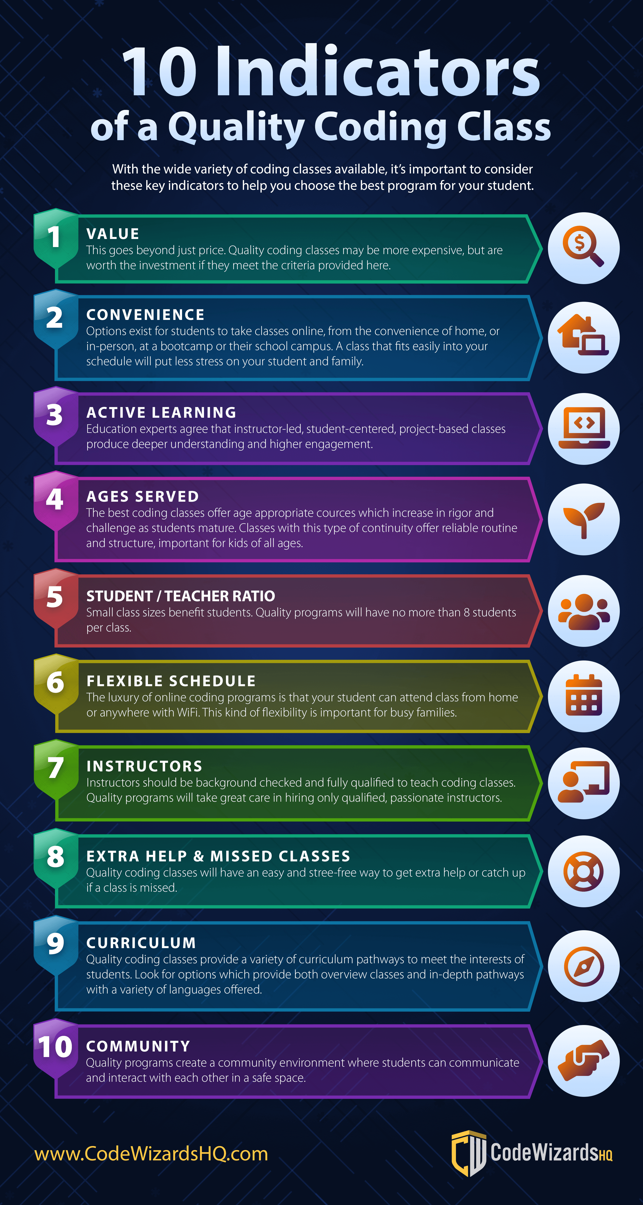 With the myriad of options available to parents these days, it can be difficult to determine which kids coding classes are best for your child. This decision can be even more daunting for parents that don’t have a background in computer science. Fortunately, there are several key indicators that you can use to judge the quality of a program and help choose the best option for your child. Make sure to consider the course curriculum, code languages taught, the quality of instructors, and also the level of support you’ll receive.