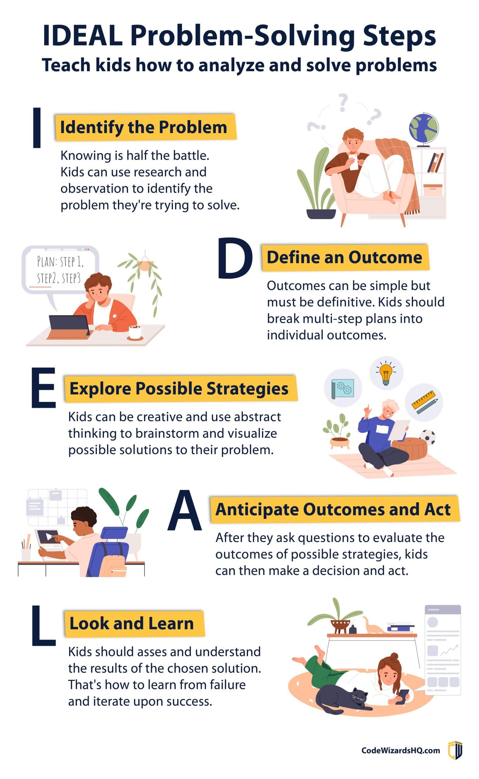 - Act! For kids who like to learn hands-on, just diving into the rest of the problem-solving process can be educational in its own way. Sometimes you need to break a few eggs to make the omelet (of problem-solving).