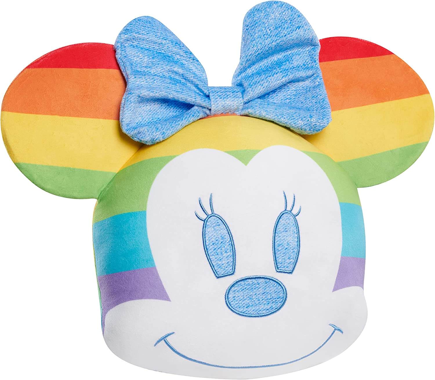 11-inch Minnie Mouse plush character head with rainbow stripes and sparkly faux denim. Perfect for use as a stuffed animal or decorative pillow.